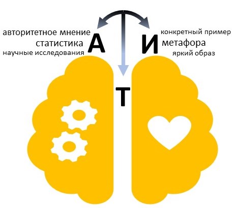 Метафорически эту технику можно передать следующим образом: чтобы идея попала в мозг, ее нужно загрузить через два портала: логический и чувственный.