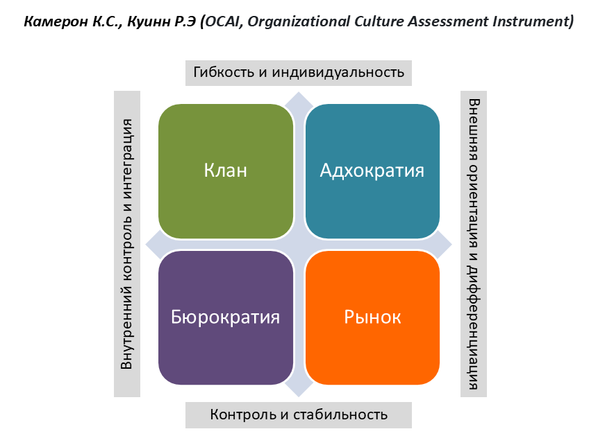 В своей практике (в тренингах и консалтинговых проектах, связанных с формулированием элементов философии) мы чаще всего используем типологию, основанную на концепции конкурирующих ценностей, предложенной в 1981 Кимом Камероном и Робертом Куинном (Organizational Culture Assessment Instrument, OCAI). Авторы обратили внимание в своем исследовании на моделях поведения бизнесов и предприятий на разных «рынках» и различия в культурных установках персонала.