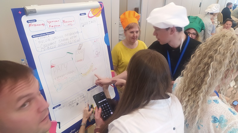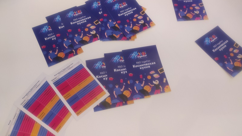 Мы разработали игру на космическую тему — каждая команда стала комбинатом космического питания, который должен из предложенного состава ингридиентов (а также параметров калорийности, содержания микроэлементов и БЖУ) придумать рецептуру для полноценного приема пищи экипажа из трех человек с учетом ограничений (аллергия, национальные вкусовые предпочтения и т.д.).