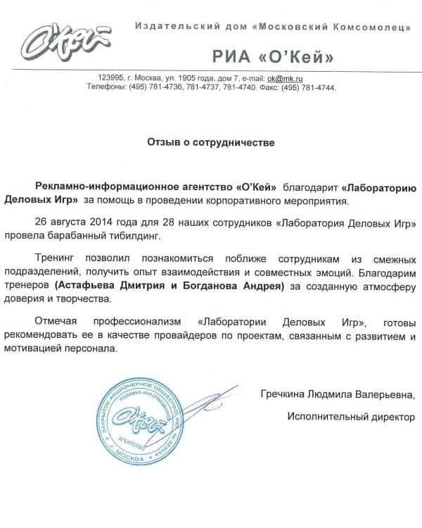Рекламно-информационное агентство «О’КЕЙ» благодарит «Лабораторию Деловых Игр» за помощь в проведении корпоративного мероприятия.